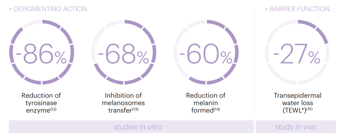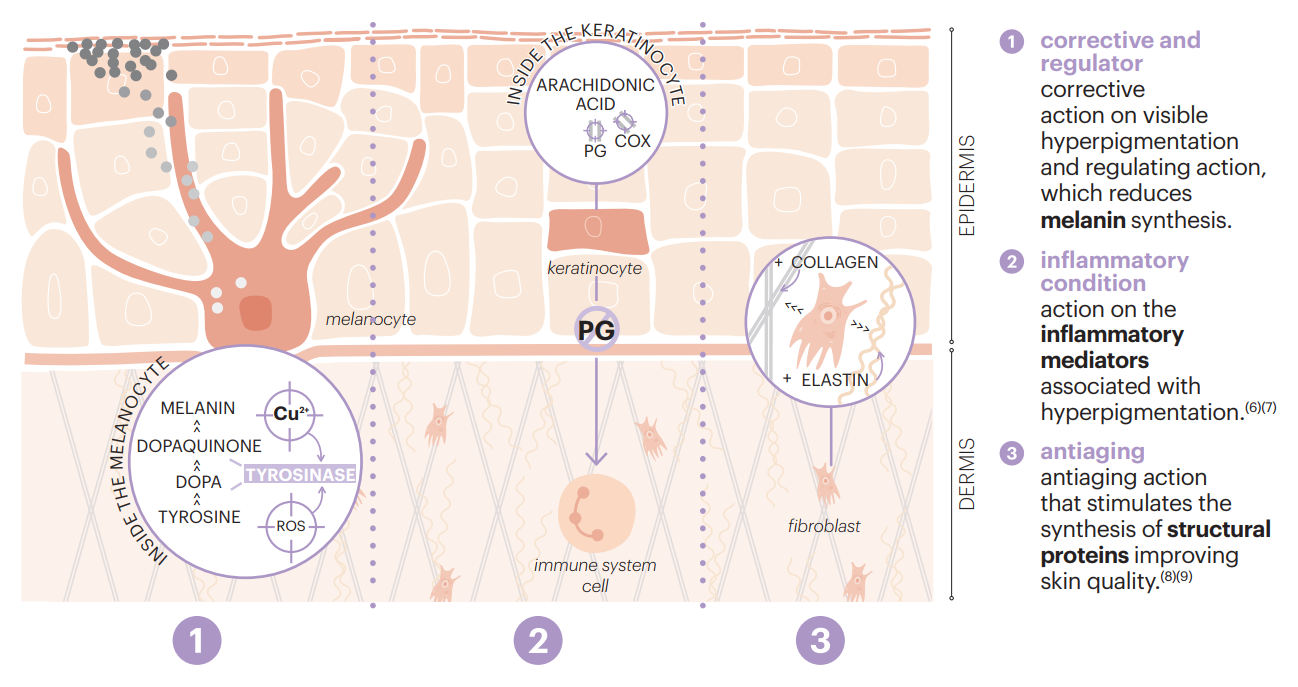 dermamelan® intimate exerts a corrective action on the accumulated melanin and a regulating action on inflammation, a characteristic component of hyperpigmentation, as well as anti-aging action, visibly improving skin quality.