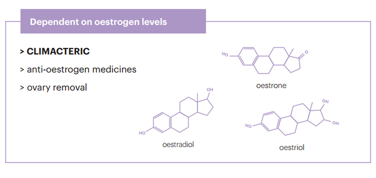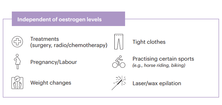 Age is a critical factor in oestrogen activity levels with symptons highest during climacteric, however there are other external factors that can cause losses in the quality of tissues and functionality of the area.(1)(2)