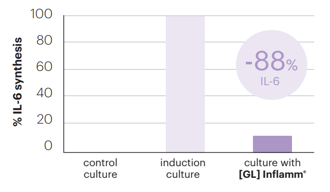 Inhibition of the production of IL-6, the main inflammatory marker, evidencing the regulatory capacity of the inflammatory component associated with hyperpigmentation. control culture induction culture culture with [meso] intimate system® 100 80 60 40 20 0 % melanin synthesis -100% control culture induction culture culture with [GL] Inflamm® 100 80 60 40 20