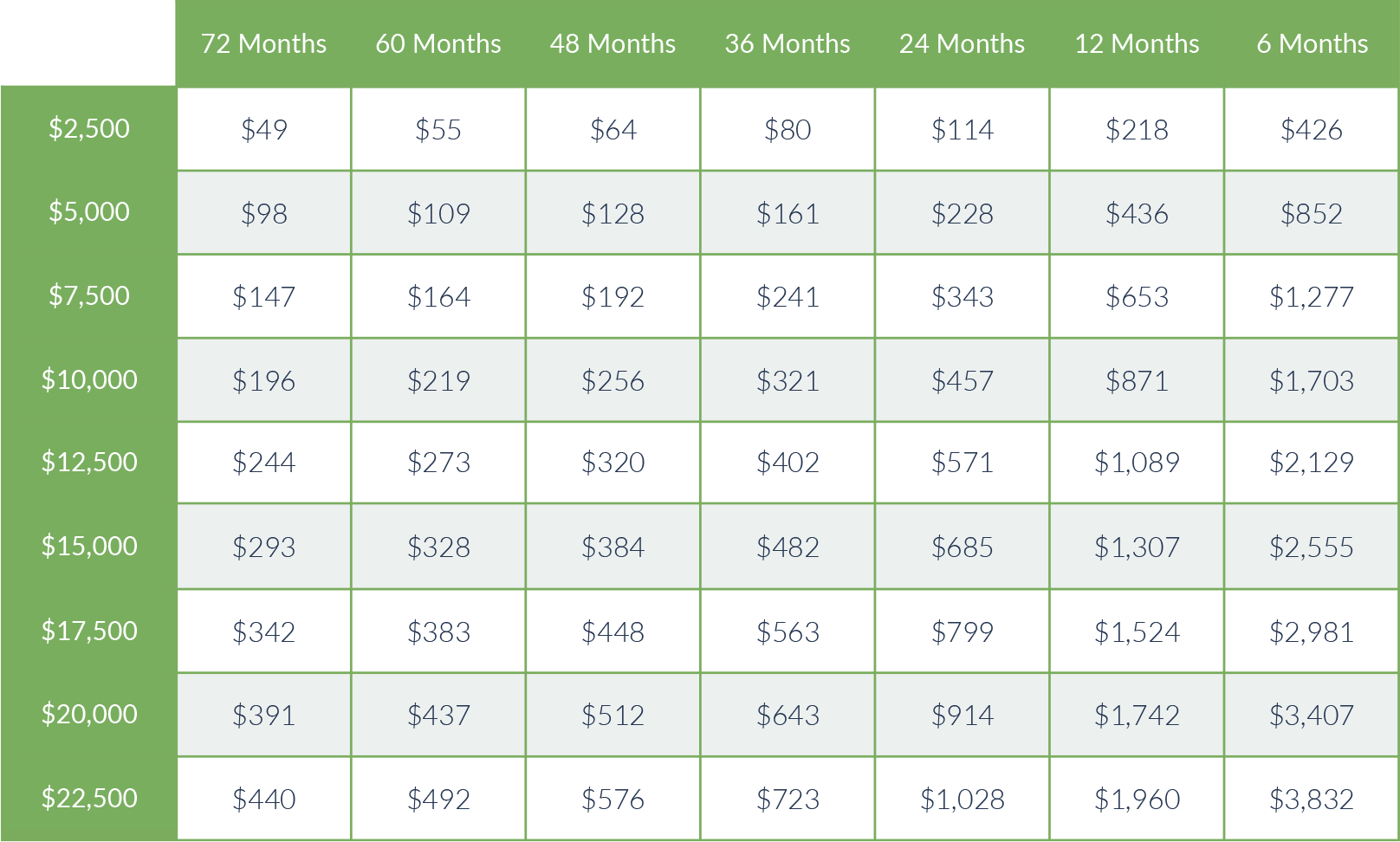 | Amount | 72 Months | 60 Months | 48 Months | 36 Months | 24 Months | 12 Months | 6 Months |
